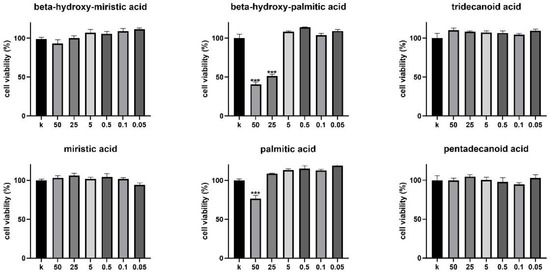 Cytotoxic effect of selected fatty acids on HeLa cells. MTT assay of HeLa cells treated with different concentrations of fatty acids (ranging from 50 to 0.05 µg/mL) for 24 h. Cell viability was expressed as % of control (K) (untreated cells), taken as 100%. Bars represent mean values, error bars represent SEM. *** p < 0.0001.