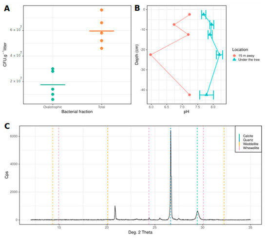 Confirmation of the existence of an active oxalate-carbonate pathway (OCP) associated with the tree Tamarindus indica. (A). Concentrations of total and oxalotrophic culturable bacteria from Tamarindus indica litter. Horizontal lines represent the mean of the distributions. (B). pH profiles under and 15 m away from the tree. Bars represent the standard error of the mean (n = 3). (C). X-ray diffractogram of the T. indica litter revealing the presence of quartz, calcite, and whewellite.