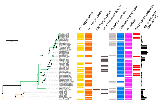 Functional traits of the fungal strains as a function of their phylogenetic relationships. Branches of the maximum-likelihood tree are colored by phylum (Ascomycota in green, Basidiomycota in mauve, and Mucoromycota in brown). Filled dots represent Chi2-based parametric approximate likelihood-ratio test values ≥ 0.9 and open dots values ≥ 0.7. The phylogenetic tree includes 50 strains encompassing 23 genera: Aspergillus (n = 7), Absidia (n = 5), Sirastachys (n = 5), Pseudoseptoria (n = 4), Amorocoelophoma (n = 3), Neopyrenochaeta (n = 3), Neurospora (n = 3), Penicillium (n = 3), Trichoderma (n = 3), Bartalinia (n = 1), Ceratobasidium (n = 1), Ciliochorella (n = 1), Cunninghamella (n = 1), Dialonectria (n = 1), Fusarium (n = 1), Lichtheimia (n = 1), Nigrosabulum (n = 1), Ochroconis (n = 1), Phomatodes (n = 1), Pseudocoleophoma (n = 1), Purpureocillium (n = 1), Wardomycopsis (n = 1) and Xylogone (n = 1).