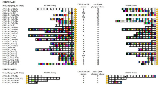Supplementary Materials Figure S1 shows the different genetic organizations for I-E and I-F1 systems regarding the module located between the two CRISPR arrays, comprising the cas set of genes and adjacent ORFs. The cas genes nomenclature follows the recommendations of Makarova et al., 2020 [26]. As other authors described, we found a higher diversity of structures in I-E systems, probably due to deletions and rearrangements promoted by IS elements [27]. In fact, a truncated IS186, which has been suggested to guide the CRISPR/Cas evolution owing to its affinity for GC-rich regions (very frequent in distinct points of the system), was found inserted within the cas3 gene in C7973 and C7974 strains. Among the remaining cas genes, only cas2 was present (variant B in Supplementary Materials Figure S1). Further, in the strain C7347 (phylogroup B2) carrying the CRISPR/Cas I-E a partial deletion of cas7 and cse1 genes and the absence of the complete copy of cse2 was observed (variant A * in Supplementary Materials Figure S1). However, CRISPR 1 and 2 arrays were present, bearing low number of spacers (four and one, respectively), which probably reflect the non-functionality of the system and the progressive loss of spacers (Figure 1).