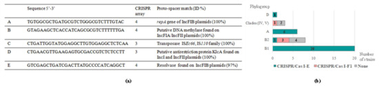 (a) Complete spacer sequences matching at least 97% with known plasmids or IS regions. (b) Distribution of CRISPR/Cas I-E and I-F1 systems among E. coli phylogroups.