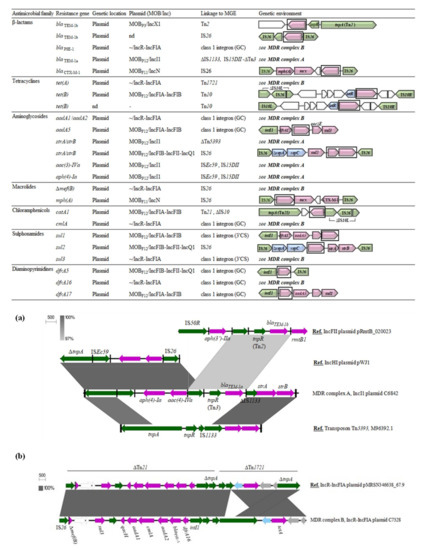 Figure 3 summarizes the genetic surrounding of the main resistance determinants found in the present study. Most of them were included in larger resistance complexes involving different hybrid transposons and insertion sequences, but the resolution of the complete structure was not possible in all cases due to the limitations of short-read sequence data. We therefore showed those well-characterized gene associations owing to a high coverage and previous experimental assays. It should be noted that resistance gene patterns predicted by in silico analyses were consistent with the phenotypic resistance patterns obtained by the disk-diffusion method.