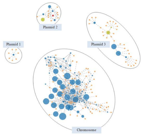 Figure 4 shows the PLACNETw reconstruction of the extended-spectrum β-lactamase producing C7328 strain. Plasmid 2 showed a MOBF11 relaxase (red node) and an IncN replicon type (yellow node) and harbored the blaCTX-M-1 in an IS26 composite transposon. An incomplete macrolide resistance cluster, with an entire mphA and a truncated mrx gene, were located downstream of blaCTX-M-1, leading to the gene block IS26-mph(A)-∆mrx-orf477-blaCTX-M-1-∆ISEcp1-IS26. This module, first reported in IncN plasmids of human clinical isolates, has also been described in IncI1 and IncB/O replicons, which suggest the occurrence of IS26-mediated transposition events between different plasmid backbones [43,44]. In addition, C7328 strain carried a nontransferable IncR-FIA plasmid of around 70 kb, lacking the relaxase gene (plasmid 3 in Figure 4). Its backbone was highly homologous (99% coverage, 100% identity) to plasmid pMRSN346638_67.9, reported in a clinical E. coli isolate [45]. Further, both plasmids carried aadA1/aadA2, cmlA1, blaPSE-1, dfrA16, sul3 and tet(A) genes, encoding for resistance against aminoglycosides (streptomycin), phenicols, β-lactams (penicillin, carbenicillin), trimethoprim, sulfonamides and tetracycline, respectively. Their resistance regions, almost identical, consisted of a hybrid ∆Tn21/Tn1721 transposon containing a large class 1 integron (MDR complex B in Figure 3b). The C7328 strain sequenced in this work corresponded to that included in a previous study carried out using conventional PCR-based approaches [7]. There, we demonstrated the conjugal transferability of the CTX-M-1 encoding gene, but we could not determine neither its complete genetic surrounding nor the genetic basis behind the impossibility of a parallel transference of the class 1 integron and the tet(A) determinant. WGS data enabled the genome reconstruction of the strain, which provides a better understanding of the genetic background and the mechanisms involved in the antimicrobial resistance spread.