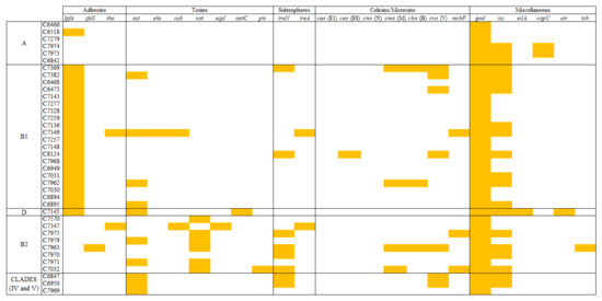 As shown in Figure 5, the occurrence of some virulence factors (VFs) varied among E. coli phylogroups. For instance, the fimbrial adhesin gene lpfA was present in all strains belonging to phylogenetic group B1, but it was absent in B2 isolates. On the contrary, vacuolin autotransporter toxin (vat) and, to a lesser extent, enterobactin siderophore receptor (iroN) were more prevalent among B2 phylogroup. These differences in VF distribution seem to be in relation with the propensity of certain E. coli phylogroups to cause particular infections. In this sense, lpfA carriage and B1 phylogroup have been associated to persistent mastitis in cattle [47], whilst B2 phylogroup is more related with avian pathogenic (APEC) and human extraintestinal pathogenic (ExPEC) E. coli strains.