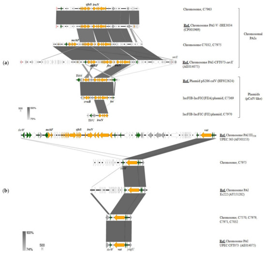Genetic location and surrounding of iroN (a) and vat (b) virulence genes in some of the E. coli strains from our collection. The reference genomes used for BLASTn comparisons are indicated as “Ref. Genetic location-Strain name-(accession number)”. Genes are colored according to their function: orange, virulence genes; green, recombination/transposition; pink, prophage genes; grey, known function; white, unknown function.