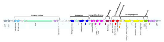 - Canchaya, C.; Proux, C.; Fournous, G.; Bruttin, A.; Brüssow, H. Prophage genomics. Microbiol. Mol. Biol. Rev. 2003, 67, 238–276. [Google Scholar] [CrossRef]