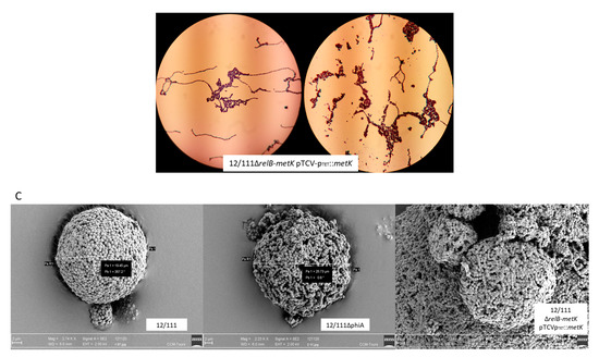 One in situ complemented mutant of the relB-metK region, i.e., 12/111ΔrelB-metK::relB-metK n°2, totally restored the phenotypes studied: (i) flocculation, (ii) long chains and large chain tangles, (iii) high prevalence (21.5%) of cocci with a thick layer of glycocalyx, (iv) growth characteristic of 12/111, and (v) high ability to form biofilm (Table 1; Figure 4 and Figure 5). The remaining in situ complemented mutants did not restore any of the studied phenotypes, suggesting the onset of secondary mutations in the course of mutant’ construction, potentially preventing phenotype restoration.