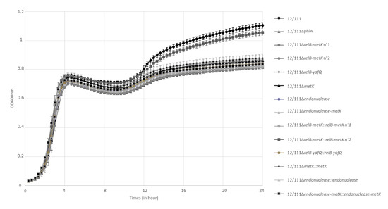 The in silico analysis of the WGS of WT 12/111 confirmed the 60,651 pb prophage genome inserted at a site flanked by adaA (upstream) and ybjI (downstream) bacterial genes. The 12/111phiA genome exhibits a GC content of 42% and contains 58 ORFs organized in modules and mostly encoded on the reverse strand (Figure 1). The packaging module is followed by three morphogenesis modules dedicated to head, head–tail, and tail, respectively, by the host lysis module. The tail morphogenesis module includes a 1039-codon-long ORF, encoding the tail tape measure protein, highly suggestive of 12/111phiA belonging to the Siphoviridae family [39,40,41]. Upstream of the packaging module are the lysogeny and replication modules. The lysogeny module has two peculiarities: first, in silico analysis did not reveal any integrase, but rather a transposase with an integrase core domain; second, CI and the Cro repressor are separated by a 12 kpb long DNA element including a 7035 bp ORF encoding a protein similar to StrP (100% coverage, 100% identity), a protein described in the phiStag1-like prophage associated with the emerging lineage CC17-1A recently described in neonates [19]. Downstream of the replication module is a foreign DNA defence module with a restriction–modification (RM) system. The search for prophage ORFs that could potentially benefit the host revealed a region in the foreign DNA defence module comprising four ORFs, including three which have been associated with cell persistence and biofilm formation [42,43,44]: first, relB and yafQ, two ORFs in the same direction and separated by three nucleotides, coding for putative RelB antitoxin and YafQ toxin, i.e., a type II TA system [45,46]; and a second couple of ORFs in the same direction and separated by one nucleotide, i.e., one encoding a putative endonuclease and metK, a gene encoding a putative S-adenosylmethionine synthetase, an enzyme that catalyzes the conversion of methionine to S-adenosylmethionine (SAM) [16,42]. We compared the prophagic amino acid sequences of RelB, YafQ, and MetK with the available sequences of bacterial functional homolog proteins [45,47] (Table S4 and Figure S1): First, a 26–30% similarity at the amino-acid level (48–66% cover) was found between the sequences of three RelB antitoxins [45] and the 12/111phiA_RelB sequence (Table S4; Figure S1A). Second, 33% identity (44–93% cover) was found between the 12/111phiA_YafQ sequence and those of two RelE toxins [45] (Table S4; Figure S1B). Moreover, the amino acids considered as essential for the functional activity of the YafQ protein were found in the prophage sequence [48,49]. Third, a 44–57% similarity (95–97% cover) was found between the 12/111phiA_MetK sequence and that of 12/111 host MetK, and those of two functional MetK described in E. coli [47]. The sequences of 12/111phiA_MetK and E. coli MetK differed by a 135-amino-acid truncation, but without impacting the domain involved in SAM synthetase activity (Table S4; Figure S1C). Overall, our data argue in favor of five prophagic genes encoding a type II TA system, an endonuclease, and MetK, similar to homolog proteins of bacterial origin and, thus, likely functional for the host, along with a putative StrP-like adhesin.