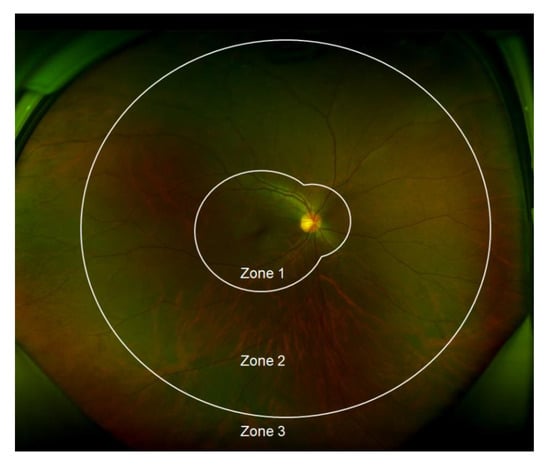 The following variables were examined in each patient: (i) demographic variables (i.e., age, sex, underlying disease, total follow-up period, and mortality); (ii) clinical laboratory variables (i.e., peak CMV DNA polymerase chain reaction (PCR) titer [], absolute neutrophil count (ANC) at diagnosis, and duration of CMV viremia); and (iii) ocular variables (i.e., best-corrected visual acuity (BCVA), presence of active retinitis at the time of CME development, the extent of disease involvement, number of intravitreal ganciclovir injections, recurrence of CMV retinitis, and ocular complications). As for BCVA, measurements at the initial visit and the last follow-up visit were used. The involved zones of CMV retinitis were categorized as zones 1, 2, and 3 according to the area of involved fundus (Figure 2). Responses to treatment were categorized as complete resolution, partial resolution, and no response. Cases with complete disappearance of CME after 3 months of treatment were categorized into the complete resolution group, and cases in which CME remained or relapsed within 3 months after discontinuation of treatment despite short-term improvement were categorized into the incomplete resolution group. Cases showing no improvement after 3 months of consecutive treatment were categorized into the no response group.