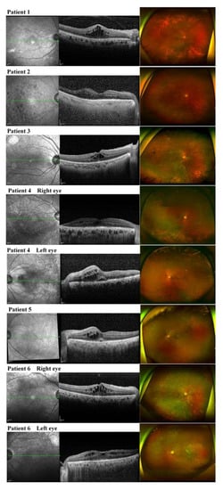 - Cassoux, N.; Lumbroso, L.; Bodaghi, B.; Zazoun, L.; Katlama, C.; LeHoang, P. Cystoid macular oedema and cytomegalovirus retinitis in patients with HIV disease treated with highly active antiretroviral therapy. Br. J. Ophthalmol. 1999, 83, 47–49. [Google Scholar] [CrossRef] [PubMed][Green Version]