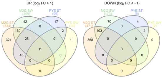 Venn diagrams showing overlap between upregulated (left) and downregulated (right) genes upon Cu stress in all experimental conditions.