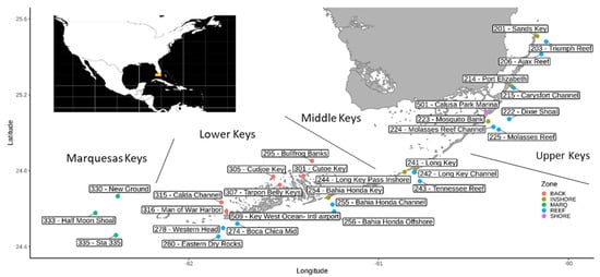 Map of the sampling sites (main graph) and location of the Florida Keys (upper left corner). Sampling sites are color-coded: BACK—Backcountry; INSHORE—Inshore; MARQ—Marquesas Keys; REEF—Reef; SHORE—Shore.