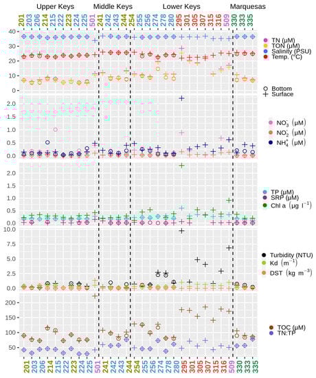 The water temperature at the stations varied by 4 degrees between 21.9 °C and 25.9 °C. Samples collected at shore and Lower Keys backcountry stations differed significantly by their physicochemical properties, including higher TOC content and increased turbidity (Figure 2). The highest Chl a and ammonium concentrations were also found among these stations (stations 295 and 509).
