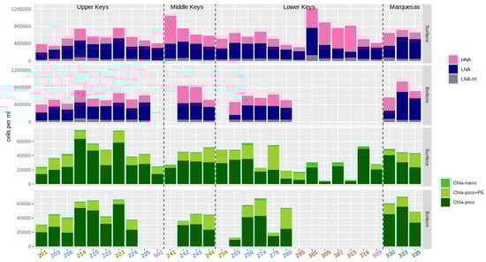 Phytoplankton cells were discriminated by their size into pico- and nanoplankton groups (0.2–2.0 µm and 2.0–20 µm, Chla-nano). Picoplankton cells were also subdivided by their pigmentation: only Chl a containing cells (Chla-pico) and those additionally possessing phycoerythrin (Chla-pico+PE; Figure 3). Chla-pico was the most abundant phytoplankton group with cell densities between 3.6 × 103 and 6.4 × 104 cells mL−1. Chla-pico+PE abundances varied significantly, reaching 3.3 × 104 cells at inner reef station 278, where it was the most abundant phytoplankton group. Highest nanophytoplankton (Chla-nano) abundances were observed at Lower Keys backcountry sites (up to 5.6 × 103 cells mL−1), whereas phytoplankton abundances overall varied drastically between the stations (Figure 3).