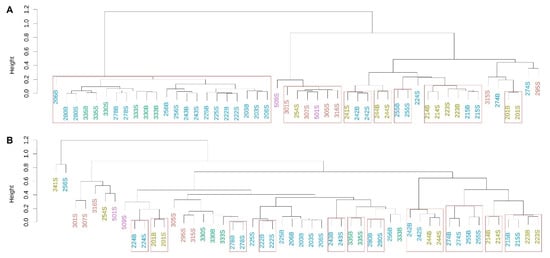 Cluster dendrograms (unweighted pair group method with arithmetic mean, UPGMA) based on weighted UniFrac distance matrices for prokaryotic (A) and eukaryotic (B) communities. Significant clusters (approximately unbiased p-values, AU, ≥95%, 1000 iterations) are indicated with by red boxes. The color code for the stations follows Figure 1.