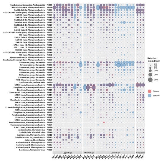 In the Lower Keys, members of Flavobacteriales represented around one-fifth of the PCC (20.1%), roughly two-fold higher compared to other study areas. Rhodobacterales (13.1%) was the second most abundant microbial order, and its relative abundance in the Lower Keys was around five-fold higher than in the Marquesas Keys (2.4%), where SAR86 and SAR11 clades were the dominant taxa (28.2% and 19.0%, respectively).