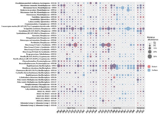 Within Bacillariophyta, raphid-pennate diatoms were the most abundant group represented by OTU2 and OTU19 (Figure 6). OTU2 was relatively abundant in all study areas and contributed to around a quarter of the EMC at reef station 280. Other abundant OTUs related to diatoms included representatives of the genus Minidiscus (OTU4), which contains species that represent the smallest centric diatoms of the marine phytoplankton []. Chaetoceros, which is probably the most diverse genus of marine planktonic diatoms, was more prevalent at stations in Middle and Marquesas Keys than in the other locations (OTU14).