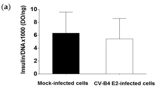 Profile of proinsulin, insulin, and pro-hormone convertase 2 in pancreatic β cells persistently infected with CV-B4 E2. Mock and pancreatic β cells (INS-1 cell line) persistently infected with CV-B4 E2 were cultured for 2 h in RPMI-1640 medium, and the supernatant was recovered. The cells were then lysed to extract total DNA and RNA (a) The concentrations of proinsulin and insulin in the supernatants of cultures were evaluated using ELISA. The ratios of proinsulin (PI) and insulin (I) concentrations were calculated. The results are expressed as % of the PI:I ratio compared with the PI:I ratio obtained with mock-infected cultures (control cells). The PI:I ratio of mock-infected cells is represented by a dotted line. Values are the mean ± SD of 10 independent experiments, * p < 0.05. (b) Pro-hormone convertase 2 (PCSK2) mRNA was quantified using RT-qPCR. Normalization was performed with β-actin mRNA. The relative expression in mock versus CV-B4 E2-infected INS-1 cells was determined with the 2−ΔΔCt formula. The value of PCSK2 expression in uninfected cells is represented by a dotted line. The values are the mean ± SD of three independent experiments encompassing 4 to 6 replicates each, ** p < 0.001.