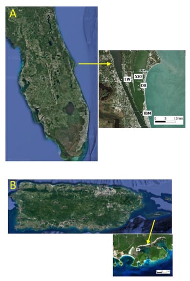 Map depicting sampling sites in (A) Indian River Lagoon, FL and (B) Mosquito Bay in Vieques, Puerto Rico. Florida sampling sites: TBM = Telemar Bay Marina, DB = Diamond Bay, LW = Lee Wenner Park, 520 = 520 Bridge. MB (Vieques map) = Mosquito Bay.