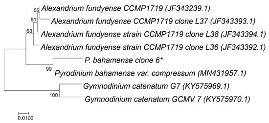 Sequence data were trimmed of primer and vector sequences and initially queried against the GenBank nr database using standard BLASTN 2.2.26+ []. All subsequent analysis was performed using MEGA (Molecular Evolutionary Genetics Analysis) v7. The phylogenetic relationship among sequences in relation to geographic location (as defined by the four sampling sites) was examined to assess whether sequences were specific for a location. SxtA4 clone sequences obtained from individual cells representative of the four sampling sites as well as Alexandrium spp. sxtA4 sequences retrieved from GenBank were used in the analysis. The model that best fit the data was the Tamura 3-parameter (T92) and so was used to generate Neighbor Joining and minimal evolution trees. Both trees produced identical results. The sequence data were also compared to existing Pyrodinium sxtA4 sequences in GenBank (MN431957.1, a 358bp fragment, designated as var. compressum from Sepanggar Bay, Malaysia; and a 681 bp sequence, from TSA GBXF01000001.1, also designated as var. compressum).