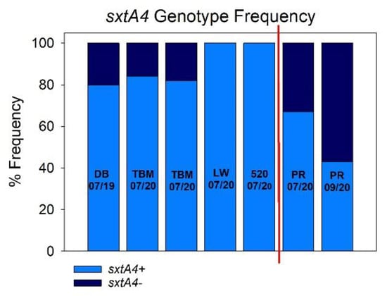 In the IRL, the frequency of the sxtA4+ genotype ranged from ca. 80–100% (Table 3, Figure 3). Sampling at Diamond Bay (July 2019) showed the sxtA4+ genotype to occur at 80% frequency. Comparable numbers were obtained for samplings at Telemar Bay Marina in 2020 in both June and July, with the sxtA4+ genotype occurring at frequencies of 81% and 84%, respectively. The sxtA4+ genotype occurred at a frequency of 100% in populations from sites LW and 520. The sxtA4+ genotype occurred at a much lower frequency in Mosquito Bay (Puerto Rico) populations, at ca 67% in July and decreasing to ca 40% in Sept (Figure 3). While these data must be interpreted with caution due to the low sample size, these are the first data demonstrating the presence of sxtA4 in P. bahamense populations in bioluminescent bays in Puerto Rico.