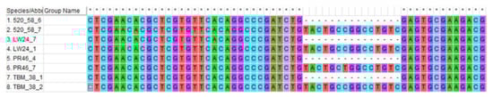 - Altschul, S.F.; Gish, W.; Miller, W.; Myers, E.W.; Lipman, D.J. Basic local aligment search tool. J. Mol. Biol. 1990, 215, 403–410. [Google Scholar] [CrossRef]