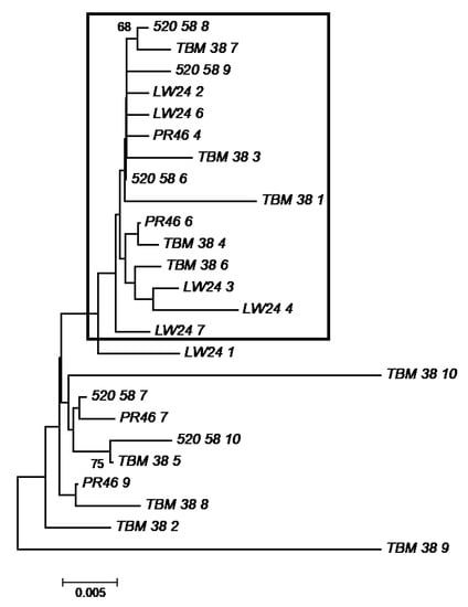 To examine the extent of sxtA4 gene variation within individual cells from different populations, the sxtA4 amplicon (yielded with the 166F/680R primer pair for an amplicon length of ca. 500 bp) from a small subset of individual cells (one representative of each site in the IRL plus MB) was cloned, and a minimum of 10 clones from each sequenced. Amplicons were cloned into the pCR-4 vector using the TOPO TA cloning kit (Invitrogen), transformed into chemically competent TOP10 E. coli cells following the manufacturer’s instructions for kanamycin selection, and sequenced using the M13 forward and reverse primers by GeneWiz (Germantown, MD, USA).