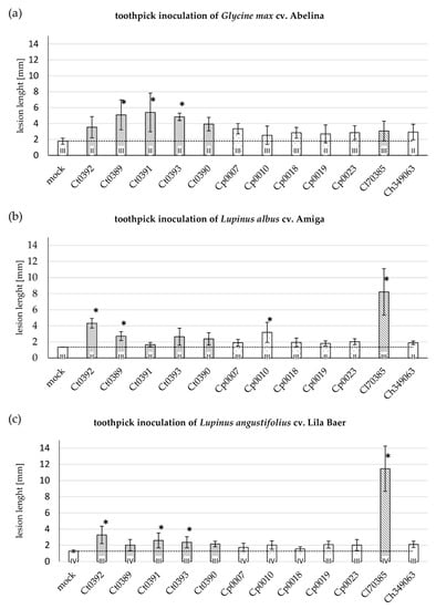 In the toothpick assay, C. lupini caused the largest lesions on both lupin cultivars Amiga and Lila Baer (Figure 1b,c). The interactions of lupin with the other Colletotrichum isolates revealed a more differentiated picture between L. albus (Figure 1b) and L. angustifolius (Figure 1c), which might be attributed to differences in the basal resistance of both lupin cultivars.