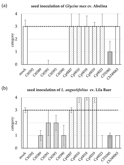 To assess the cross-infectivity of different Colletotrichum isolates on soybean and lupin in an independent assay, we performed seed inoculation experiments. This assay is assumed to be closer to the natural mechanism of plant infection because the fungus must infect the seedling without previous wounding. The same set of fungal isolates as in the toothpick-inoculation assay was tested on soybean cv. Abelina and narrow-leafed lupin cv. Lila Baer (Figure 2).