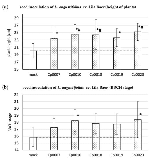 Plant growth-promoting effect of C. plurivorum inoculation on lupin development. In an independent experiment, heights of L. angustifolius cv. Lila Baer plants after inoculation of seeds with different C. plurivorum isolates were measured five weeks after sowing (a). The plants were also scored according to a lupin-adapted BBCH development scale (b). Bars represent the mean value of at least five plants and error bars show standard deviation in case of (a). In (b), ordinal data are presented; thus, median and mean absolute deviation from the median are depicted. Statistical significance in relation to the mock inoculation was tested with a one-way ANOVA analysis followed by Dunnett’s (p < 0.05, number sign) or Holm-Sidak (p < 0.05, asterisk) post hoc test (a). In (b), the test for statistical significance was performed by a one-way ANOVA analysis on ranks, followed by Dunn’s post hoc test (p < 0.05, asterisk). In both graphs, the dashed line represents the mean value of the mock control. The experiment was repeated once with similar results.