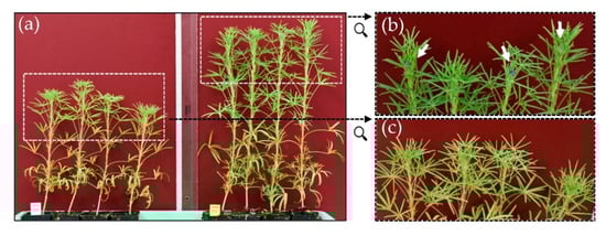 Plant growth-promoting effect of Colletotrichum plurivorum in the seed inoculation assay. Comparison of plants from L. angustifolius cv. Lila Baer after treatment of seed without (a, left side) or with C. plurivorum isolate LFN0010 (a, right side) seven weeks after sowing. (b,c) Enlargements of the respective white dashed boxes in (a), indicated by black arrows. White arrows in (b) point to developing flowers. Pictures correspond to data shown in Figure 3.