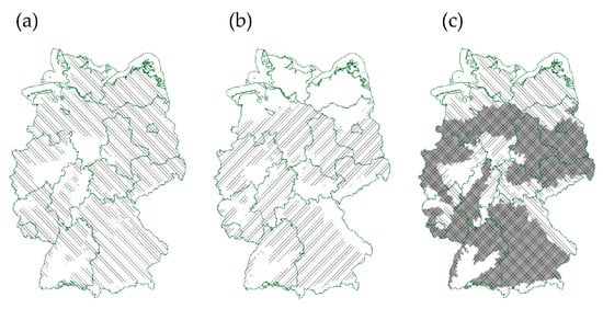 Comparison of potential cultivated area for narrow-leafed sweet lupin and soybean in Germany. Possible areas for cultivation of narrow-leafed sweet lupin (a vertical hatching) and soybean (b, vertical hatching) based on soil–climate areas are illustrated. An overlay of (a) and (b) shows the overlap of areas (c, gray-underlaid cross-hatching). Data for maps were obtained and modified from Julius Kühn-Institut (geoportal.julius-kuehn.de, accessed 1 May 2021) under license according to German GeoNutzV and from German Federal Agency for Cartography and Geodesy (http://www.bkg.bund.de, accessed 1 May 2021) under Data license Germany—attribution—Version 2.0 (dl-de/by-2-0).