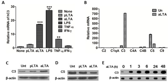 C3 induction by aLTA (lipoteichoic acid isolated from S. aureus cell wall). (A) THP-1 cells were stimulated with the indicated ligands for 6 h and mRNA levels of C3 were measured using real-time PCR. (B) The mRNA expression level of complement components induced by aLTA was compared to C2 (C2 was set to 1-fold). C3 (C) and C5 (D) protein levels were examined by Western blot after THP-1 cells were stimulated with pLTA or aLTA for 24 h. (E) THP-1 cells were stimulated with aLTA for the indicated times and C3 protein was examined by Western blot. The amount of ligand used in the experiment was 100 μg/mL aLTA and pLTA (LTA isolated from L. plantarum), 500 ng/mL lipopolysaccharide (LPS), and 10 ng/mL tumor necrosis factor alpha (TNF-α) and interferon gamma (IFN-γ). The mRNA level was normalized with glyceraldehyde 3-phosphate dehydrogenase (GAPDH). The data are displayed as the mean ± SD of three independent experiments. Statistical analysis was conducted with a one-way ANOVA. ** p < 0.01, *** p < 0.001 as compared to the control (none). β-actin was used as the internal loading control.