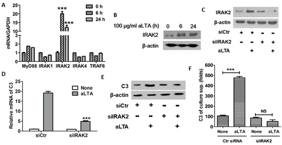 To examine the role of adaptive proteins in aLTA-TLR2-mediated signaling pathways, adaptor mRNA levels were examined. When THP-1 cells were treated with aLTA, IRAK2 mRNA was significantly increased at 6 h treatment, and then decreased at 24 h. Other factors such as MyD88, IRAK1, IRAK4, and TRAF6 were not altered in the mRNA level by aLTA (Figure 3A). IRAK-2 protein was increased from 6 h and was greatly increased at 24 h of stimulation (Figure 3B). When IRAK2 expression was suppressed in IRAK2 siRNA-transfected cells (Figure 3C), aLTA-mediated C3 mRNA and protein expression were significantly diminished as compared to cells transfected with control siRNA. The C3 mRNA and protein expression was decreased in IRAK2 knock-down cells, while control siRNA-transfected cells increased C3 mRNA expression when transfected cells were stimulated with aLTA (Figure 3D,E). The secreted C3 level was also increased in control siRNA-infected cells but was not increased in IRAK2 knock-down cells (Figure 3F). These data suggest that IRAK2 is involved in aLTA-TLR2-mediated C3 expression.