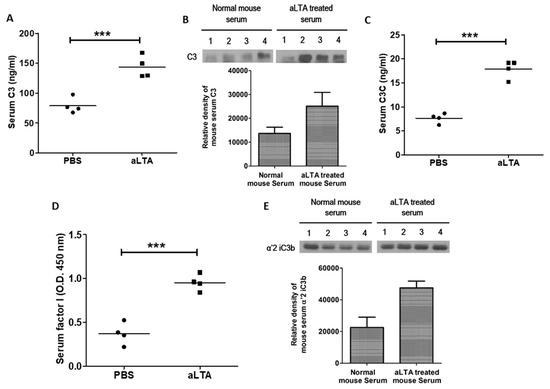 The aLTA increases C3 activity in mouse sera. Mice were injected with 50 mg/kg aLTA for 24 h and then blood was collected (n = 4). (A) The serum C3 level was examined by ELISA. (B) C3 protein level of mouse sera was examined by Western blot (upper panel) and the densitometry is shown (lower panel). (C) The serum C3C level was examined by ELISA. (D) The serum factor I level was examined by indirect ELISA. (E) The iC3b level of mouse sera was examined by Western blot (upper panel) and the densitometry is shown (lower panel). Statistical analysis was conducted with an unpaired two-tailed t-test. *** p < 0.001.