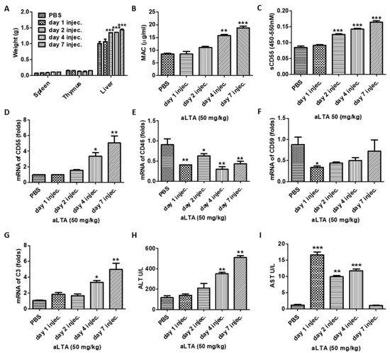 The aLTA induces organ failure. Mice (n = 4) were repeatedly injected with 50 mg/kg aLTA on the first, second, fourth, and seventh days. (A) The weight of the spleen, thymus, and liver was examined. (B) The amount of MAC was examined by ELISA from the aLTA-injected mouse serum. (C) Secreted CD55 in the sera was examined by indirect ELISA. (D–G) The mRNA level of CD55 (D), CD46 (E), CD59 (F), and C3 (G) from liver was measured using real-time PCR. Serum alanine aminotransferase (ALT) (H) and aspartate aminotransferase (AST) (I) levels were examined by ELISA. Statistical analysis was conducted with a one-way ANOVA. * p < 0.05; ** p < 0.01; *** p < 0.001.
