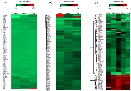 Hierarchical cluster analysis of differentially expressed BAE proteins as detected using different proteomic methodologies at different time points post-infection in E. ruminantium-infected BAE cells. 2D-DIGE-MALDI-TOF/TOF: (A) for over-expressed proteins and (B) for under-expressed proteins. (C) 1D-nLC-MS/MS. Fold-change is calculated based on the ratio infected/uninfected BAE cells.