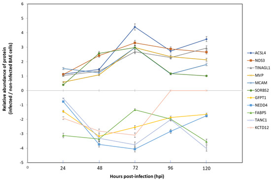 Amongst the DEPs, we noticed that the relative abundance of 6 over-expressed proteins, including Acyl-CoA synthetase long-chain family member 4 (ACSL4), Tubulointerstitial nephritis antigen-like 1 (TINAGL1), Nitric oxide synthase (NOS3), Major vault protein (MVP), Cell surface glycoprotein (MCAM) and Sorbin and SH3 domain containing 2 (SORBS2), can substantially vary during infection. For instance, the protein SORBS2 is always over-expressed during the infection, compared to non-infected cells, but a peak in protein abundance up to 7.5-fold is observed at 72 hpi (Figure 1C and Figure 2) when the bacterium is actively replicating. The under-expressed proteins Glutamine-fructose-6-phosphate transaminase 1 (GFPT1), NEDD4 E3 ubiquitin protein ligase (NEDD4), Fatty Acid Binding Protein 5 (FABP5), Tetratricopeptide repeat, ankyrin repeat and coiled-coil containing 1 (TANC1) and Potassium channel tetramerization domain containing 12 (KCTD12) can also vary. TANC1 relative abundance shows a substantial decrease (down to 6.8-fold) at 72 hpi (Figure 1C and Figure 2).