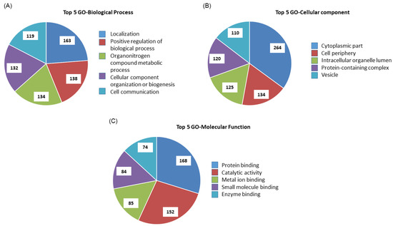 As the “first topological clustering” method, we used the Cytoscape StringApp plugin [27]. Significantly enriched GO-Biological Process, GO-Cellular Component and GO-Molecular Function terms are presented in Figure 3 and Supplementary Table S5 for DEPs in BAE host cells. The Top 5 biological processes affected by E. ruminantium infection (Figure 3A) include: localization (n = 163 proteins), positive regulation of biological process (n = 138), organonitrogen compound metabolic process (n = 134), cellular component organization or biogenesis (n = 132) and cell communication (n = 119). In the Top 5 GO component group (Figure 3B), DEPs were found to be mainly located in the cytoplasmic part (n = 264), cell periphery (n = 134), intracellular organelle lumen (n = 125), protein-containing complex (n = 120) and in vesicles (n = 110). Proteins in the Top 5 GO function group (Figure 3C) are capable of catalytic activity (n = 152) and binding activities with protein (n = 168), metal-ion (n = 85), small molecule (n = 84) and enzyme (n = 74).