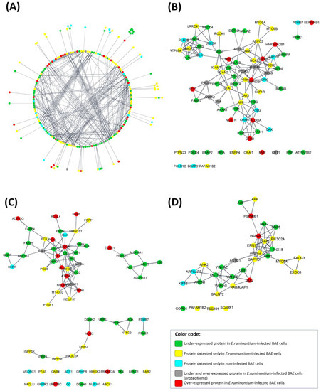 The constructed PPI network of DEPs is shown in Figure 4A; from 324 up-loaded proteins in the bioinformatic server (Supplementary Table S4), it was possible to achieve an integrated network with 209 protein nodes and 527 interactions with PPI scores ≥ 0.75, based on the STRING database (2019-04). Thirty-one proteins are over-expressed proteins in infected BAE cells, while seventy proteins are under-expressed proteins. Seventy-five proteins are detected in E. ruminantium-infected BAE cells, while twenty-one were detected in non-infected cells. We also included proteins (n = 12) whose proteoforms can be either over- or under-expressed in E. ruminantium-infected BAE cells.