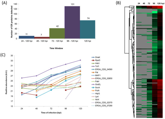 Proteins differentially expressed by E. ruminantium in BAE cells from 24 to 120 hpi based on 1DE-nLC-MS/MS. (A) Number of E. ruminantium proteins detected at each time point post-infection. (B) Hierarchical cluster analysis of differentially regulated E. ruminantium proteins at each time point post-infection, and (C) relative abundance of E. ruminantium proteins detected from 24 to 120 hpi.