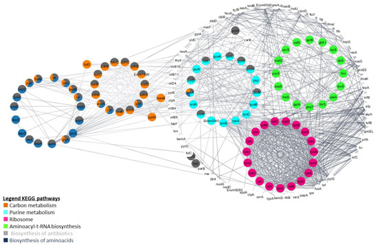 To evaluate the PPI interaction network between E. ruminantium proteins, we also used the Cytoscape StringApp plugin. The constructed PPI network of DEPs is shown in Figure 6 and contains 169 nodes and 888 interactions, with PPI scores > 0.75, based on the STRING database. To functionally characterize the PPI obtained in Figure 6, we used the StringApp to perform functional enrichment analysis with an FDR threshold of 5%. We then used the filter functionality to remove redundant terms using the default redundancy cut-off of 0.5 in KEGG pathways. Of these, we highlighted in Figure 6 the proteins associated to carbon metabolism (orange, n = 26), purine metabolism (light blue, n = 17), ribosome (pink, n = 19), aminoacyl-t-RNA biosynthesis (green, n = 16), biosynthesis of antibiotics (grey, n = 41) and amino acids (dark blue, n = 22).