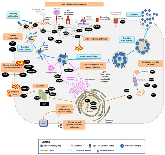 Bacterial adhesins can form a bridge with cellular integrins (such as ITGA5), inducing integrin clustering and signaling in cells [64]. This would induce a host cell invasion via Src tyrosine kinase activation; here, Src was found to be detected only in infected cells. Other molecules that regulate the establishment of integrin-containing contacts are also affected: for instance, the downregulation of the protein RAB4B may result in lower integrin association with the cytoskeleton via phosphatydylinositol 4-phosphate 5-kinase/PIP2/vinculin and talin conformational changes. Focal adhesion-specific protease calpain (which controls both turnover and activation of focal adhesion components) was found to be downregulated. We also noticed the overexpression of PTPRA and Ociad1 in infected cells, both involved in integrin-mediated focal adhesion formation. Similar results were observed with spotted fever group rickettsiae [65]. Cell–cell contact is also affected by E. ruminantium infection at several levels of contact: (i) adherents’ junctions (AJs) (CDH2 and CTNNA3 were detected only in infected cells), (ii) tight junctions (JAM3 was detected only in non-infected cells, while SYMPK was found only in infected cells) and (iii) desmosome (PNN was found to overexpressed in infected cells). It is worth mentioning that the modification of cytoskeletal proteins and/or tight junction proteins can lead to vascular permeability and to a redirection of albumin transport to peripheral tissues [66], and this could explain the downregulation of albumin (Alb) in infected cells.