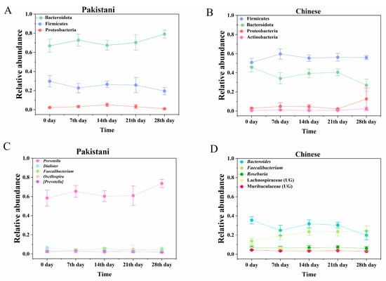 According to PERMANOVA and Mantel test, daily exercises did not affect gut microbiomes, whereas different nationalities showed the differences in gut microbiomes of Chinese and Pakistanis (Table 1). In addition, body mass index (BMI; BMI = weight (kg)/height (m)2) also affected gut microbiomes, and average Pakistani BMI (24.32) was higher than that in China (20.20) (F = 126.187, p < 0.05) (Table 1). Similarities of gut microbiomes were the same at five time points (F = 1.656, p > 0.05) in Pakistanis, and similarities of gut microbiomes in Chinese were consistent at the first four time points whereas changed at 28th day (F = 5.940, p < 0.001, Figure S1A,B). Additionally, gut microbial diversity did not present a significant difference at each time point for both Pakistanis and Chinese (Figure S1C,D). Moreover, we selected dominant microbial phyla (relative abundance >1%) and genera (top 5) in Chinese and Pakistanis respectively to investigate their temporal variations in a month. We found that these selected dominant microbial phyla or genera did not vary significantly during exercise intervention in Chinese and Pakistanis individually (Figure 1A–D).
