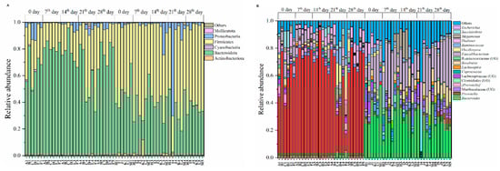 The same letters meant no statistical difference (p > 0.05) and different letters meant statistical difference (p < 0.05). Some dominant phyla (A,B) and genera (C,D) were compared in all time points based on the relative abundance via one-way ANOVA. Neither phyla nor genera were different among these 5 time points (p > 0.05).