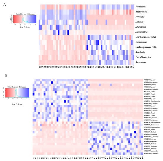 For the composition of gut microbiomes, at the phylum level (Figure 2A), the dominant microbiomes (Average relative abundance >0.1%) were the Bacteroidota (54.30%), Firmicutes (40.40%), Proteobacteria (4.21%), Actinobacteriota (0.67%), Mollicutota (0.11%) and Cyanobacteria (0.11%). At genus level (Figure 2B), the dominant microbiomes (Average relative abundance >1%) included Prevotella (32.94%), Bacteroides (15.11%), Faecalibacterium (12.48%), Roseburia (3.95%), etc. Moreover, there were many differences in the distribution of gut microbiota (Figure 3). At the microbial phylum level (Figure 3A), the Bacteroidota was more abundant in Pakistanis, whereas the Firmicutes was more abundant in Chinese. At the microbial genus level (Figure 3A), the most abundant genus in Pakistanis was Prevotella, but the most dominant genus in Chinese was Bacteroides. At the OTU level (Figure 3B), OTUs enriched in the Pakistanis were mainly included in P. copri and P. stercorea, while OTUs enriched in the Chinese were included in Roseburia, Bacteroides and F. prausnitzii mostly. However, many gut microbiomes were shared by Pakistani and Chinese people. At the genus level (Figure S2A), 161 bacterial genera (66.8%) were shared. At the OTU level (Figure S2B), 4491 common OTUs accounted for 46.4% proportion. The diversity and community structure of gut microbiomes are also distinct in different nationalities. In this study, the alpha diversity of gut microbiomes in the Chinese participants was higher than that in the Pakistani participants (p < 0.05; Figure 4A–C). Community structures of gut microbiota were also different between people with different nationalities (Table 1). There was an obvious difference in the gut microbiomes between Chinese and Pakistanis (Figure 4D,E).