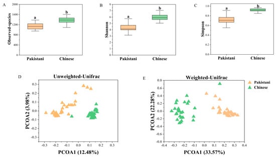 The comparison of alpha diversity based on observed-species (A), Shannon diversity (B), Simpson (C), and microbial community (D,E) between Chinese and Pakistani. The alpha diversity was compared by the Mann–Whitney U test. The mark of (a) and (b) indicated a significant difference between two groups (p < 0.05). Community structure with obvious separations were compared by PCOA based on unweighted uniFrac distance (D) and weighted uniFrac distance (E).