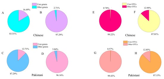 Next, we described the core microbiome in Chinese and Pakistani participants. A core microbiome usually consist of members shared by two or more microbial assemblages []. In this study, core microbiomes were defined as microbiomes found in all samples at the genus level and in 80% of samples at the OTU level. At the microbial genus level (Figure 5), the core genera in Chinese accounted for 16.49%, but their relative abundance was 97.29%. Similarly, the core genera in Pakistani only accounted for 12.71%, while their relative abundance was 96.16%. Results at the OTU level were paralleled to the genus level (Figure 5). The number of these microbiomes accounted for a small proportion, whereas the relative abundance of these microbiomes was extremely high. Then, according to the average relative abundance, the top ten core microbiomes at the genus level were identified in Chinese and Pakistanis respectively (Figure S3). The core microbiome with the highest relative abundance was the Bacteroides in Chinese and the most abundant core microbiome was the Prevotella in Pakistanis (Figure S3A,B). The distributions of core microbiomes were distinct between Chinese and Pakistanis (Figure S3C).