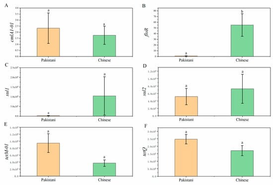 The comparison of ARGs using Mann–Whitney U test between Chinese and Pakistani. The mark of (a) and (b) indicated a significant difference between two groups (p < 0.05). (A): Comparison of cmlA1-01; (B): Comparison of floR; (C): Comparison of sul1; (D): Comparison of sul2; (E): Comparison of tetM-01; (F): Comparison of tetQ.