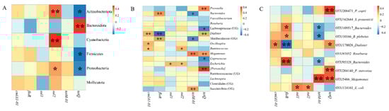 The correlations between gut microbiomes and ARGs at phylum (A), genus (B) and OTU level (C). * p < 0.05; ** p < 0.01.